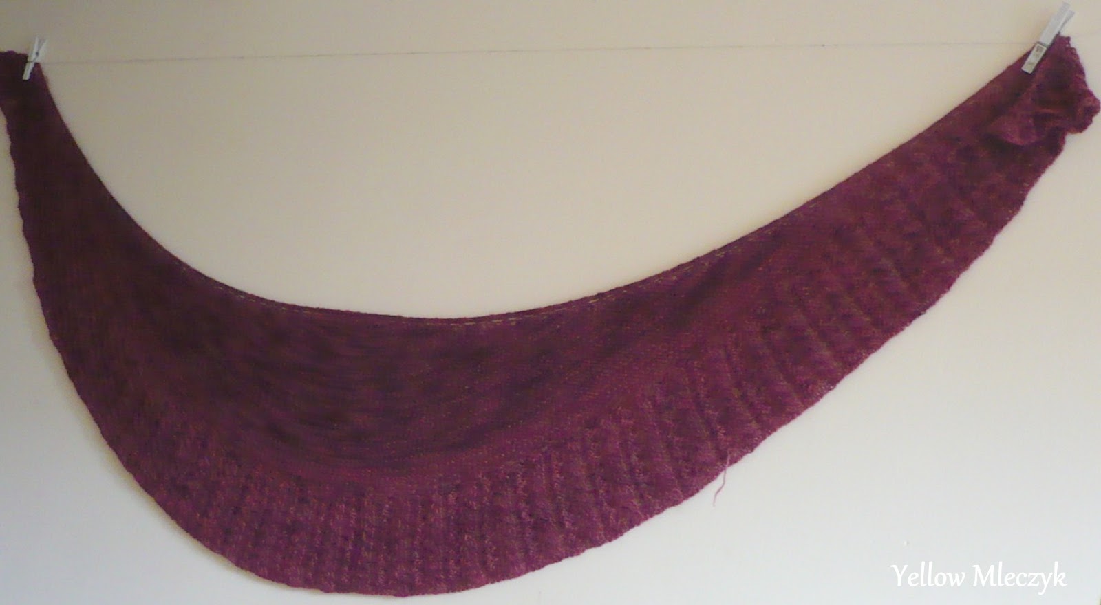 Gdy chusta jest tej samej konstrukcji i kształtu, ale nie ażurowa i nie zależy mi na pokazaniu każdego oczka i każdego narzutu, blokuję tak, jak ten Delectable – dość słabo odciśnięta woda, żeby chusta miała swój ciężar, dwa spinacze, i gotowe. Pięknie się zapada w rogal pod własną wagą.