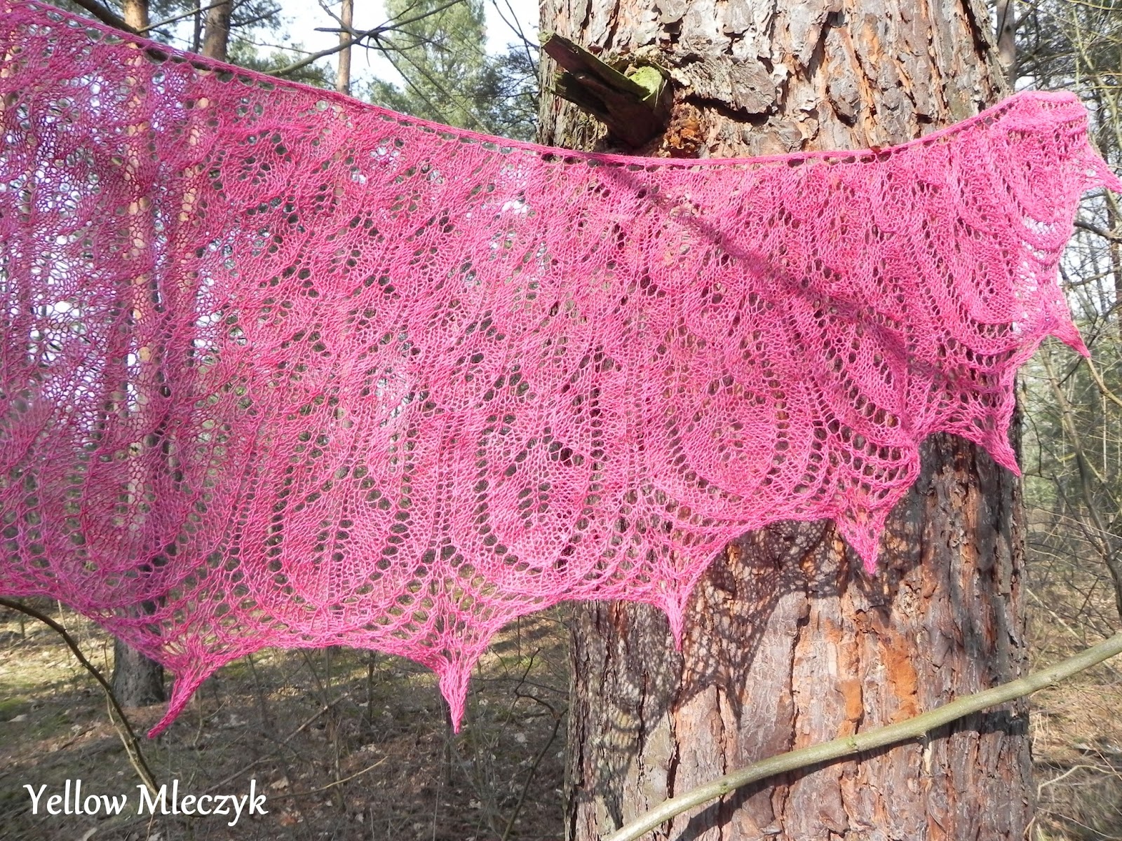 W przypadku chust trójkątnych sprawa jest prostsza, nadal obowiązuje zasada robienia luźno i przerabiania pierwszego oczka, ale konstrukcja tej chusty sprawia, że w sumie prawie nigdy nie ma problemów ze ściąganiem czy falowaniem chusty z powodu plisy.