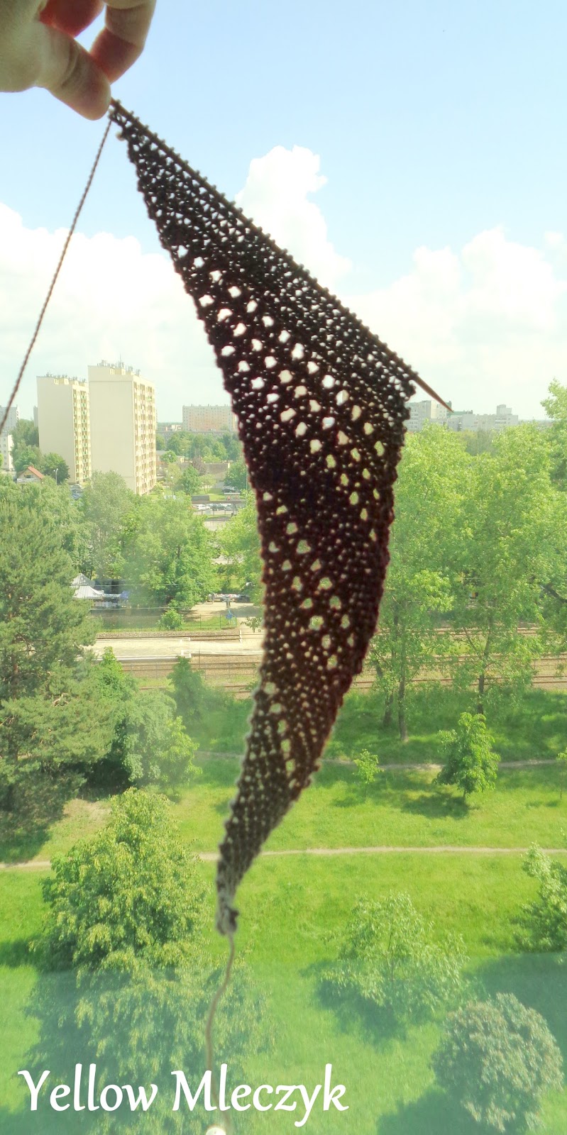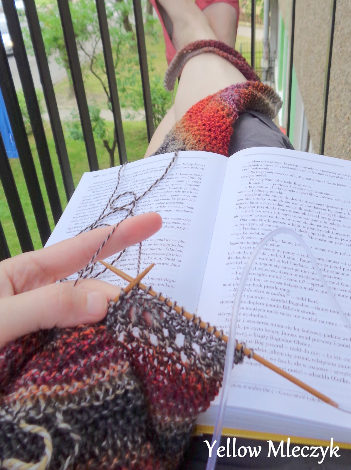 Gdy chusta zaczęła przypominać długaśny ogon jaszczurki – przestałam nosić ją ze sobą i dziergałam publicznie na balkonie. Przy okazji broniąc z panem Kmicicem Częstochowy 🙂